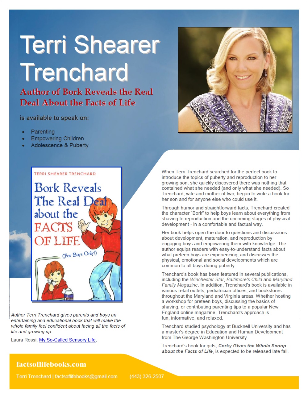 When Terri Shearer Trenchard searched for the perfect book to introduce the topics of puberty and reproduction to her growing children, she quickly discovered there was nothing that contained what she needed (and only what she needed). So Terri, wife and mother of two, wrote a book for her son, and soon learned that many other moms, dads, and caregivers needed it too. Having experienced broad popularity with the developing preteen boy crowd (and those who care for them), she ventured on to write a similar book for her younger daughter—and for those all-important beautifully developing girls.